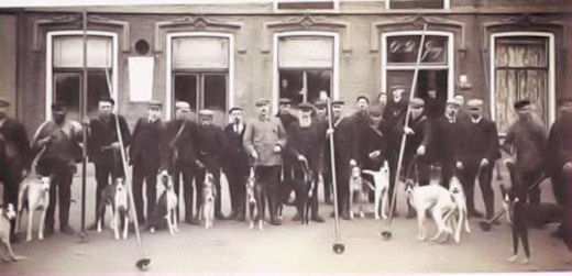 Gezelschap gereed voor de lange jacht. Let op de polsstokken waarmee over brede sloten en vaarten wordt gesprongen.