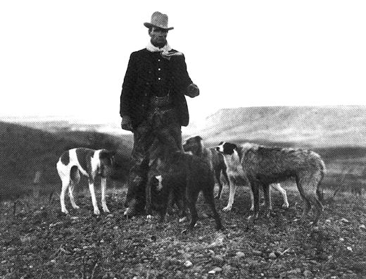 Coyotes en een grijze wolf, 1919. James Lodman, Montana.